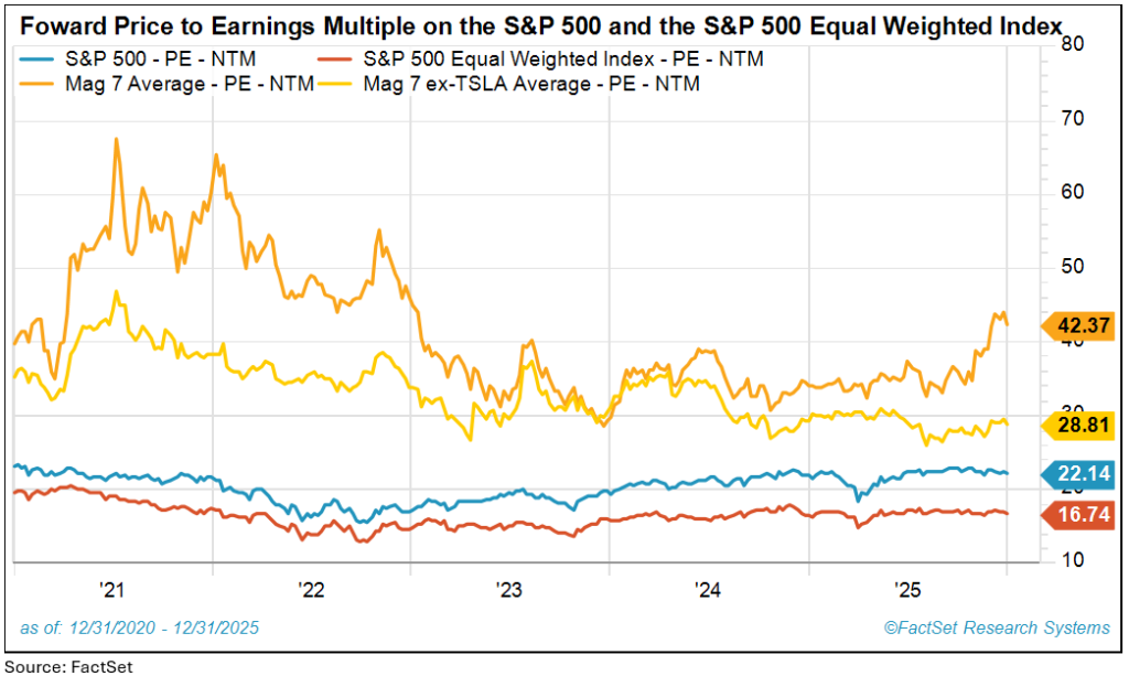 The valuation backdrop remains largely unchanged, with the S&P 500 trading at roughly 22x forward earnings at year-end—about where it began the year and approximately where it has traded for several years. Returns this year have been driven by earnings growth, not multiple expansion. Why are valuation concerns suddenly front and center? We don’t understand it.