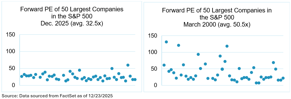 In technology, the AI “bubble” chatter has no doubt grown louder; however, we view much of this concern as premature. Today’s AI-related investment is being funded by profits and cash flow—not speculation—and is tied to real demand for productivity gains, making it very different from prior tech bubbles. The chart below illustrates that current conditions are not comparable to those seen in 2000.