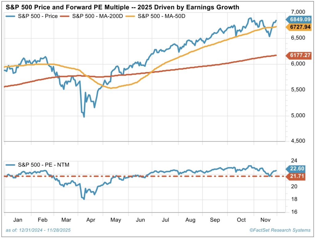 In fact, we’re thankful the market decided to take a breather here. We began the year with a 6,600 price target for the S&P 500 and noted that 7,000 was achievable sometime by mid-2026. The index ended November at 6,849, and we’d be perfectly content if it finished the year somewhere around these levels. Frankly, we’d prefer it, as it sets a more constructive stage for the year ahead.